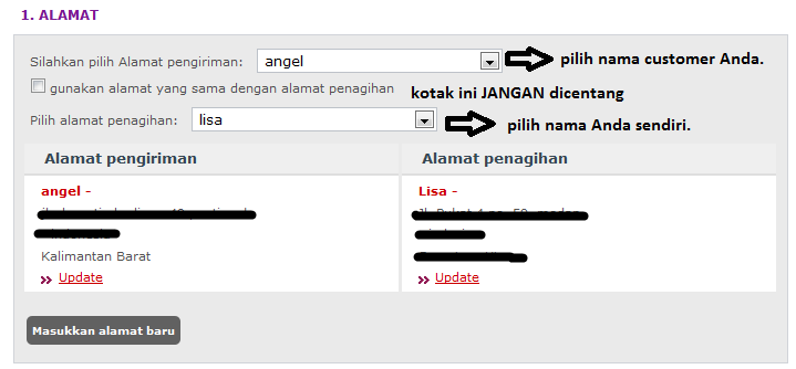 - Kotak "gunakan alamat yang sama dengan alamat pengiriman" >> JANGAN dicentang.