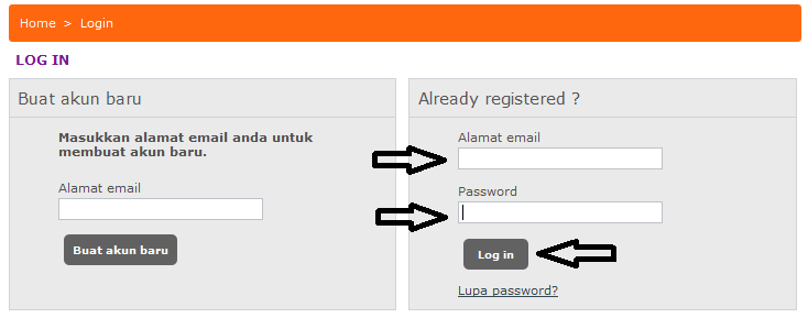 Bagi yang sudah punya akun, bisa langsung masukkan alamat email dan pasword di kolom sebelah kanan, kemudian klik: Log in.