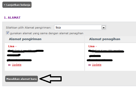 6. Selanjutnya Anda akan dibawa ke halaman Lanjutkan belanja >> klik: Masukkan Alamat Baru (untuk memasukkan alamat costumer Anda)